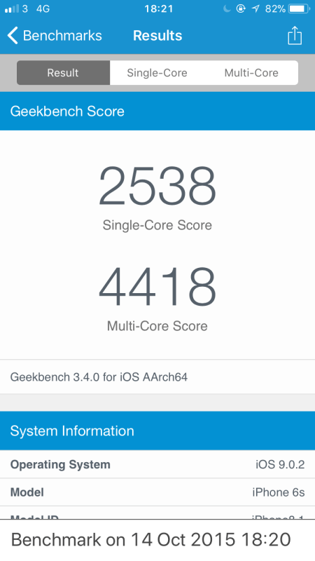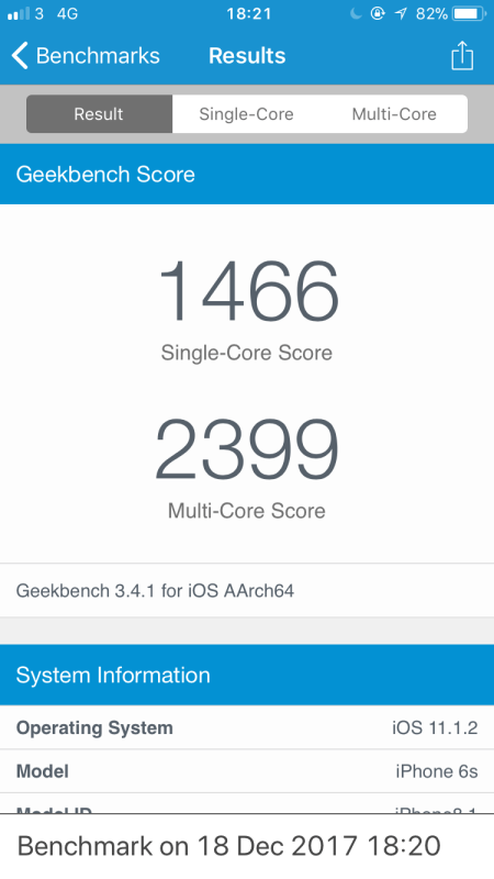 However, after upgrading to iOS 11 after much hesitation, I noticed that on my iPhone 6s that the battery life suffered from it’s usual 10% per hour usage to closer to 20% per hour. The bigger issue seemed to be performance, opening apps, taking photos and doing usual everyday tasks took seconds longer than usual. I didn’t feel that the iOS 11 update should cause such a huge performance degradation on a 2 year old device, so I looked into Geekbench results and found similar issues to those pointed out by John Poole. The following Geekbench results are from the same iPhone 6s, about 2 years apart.